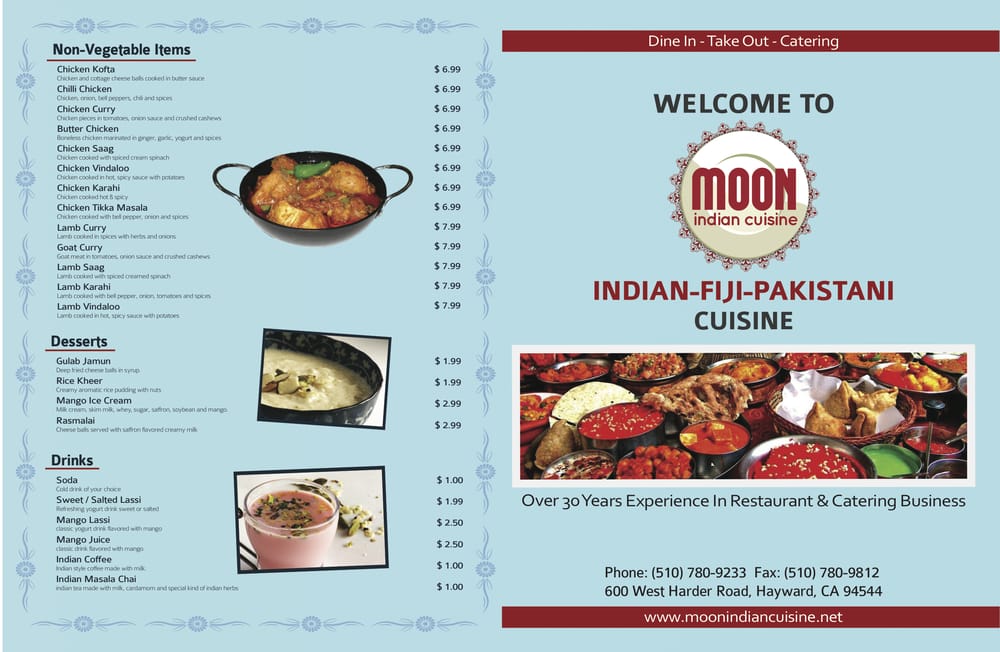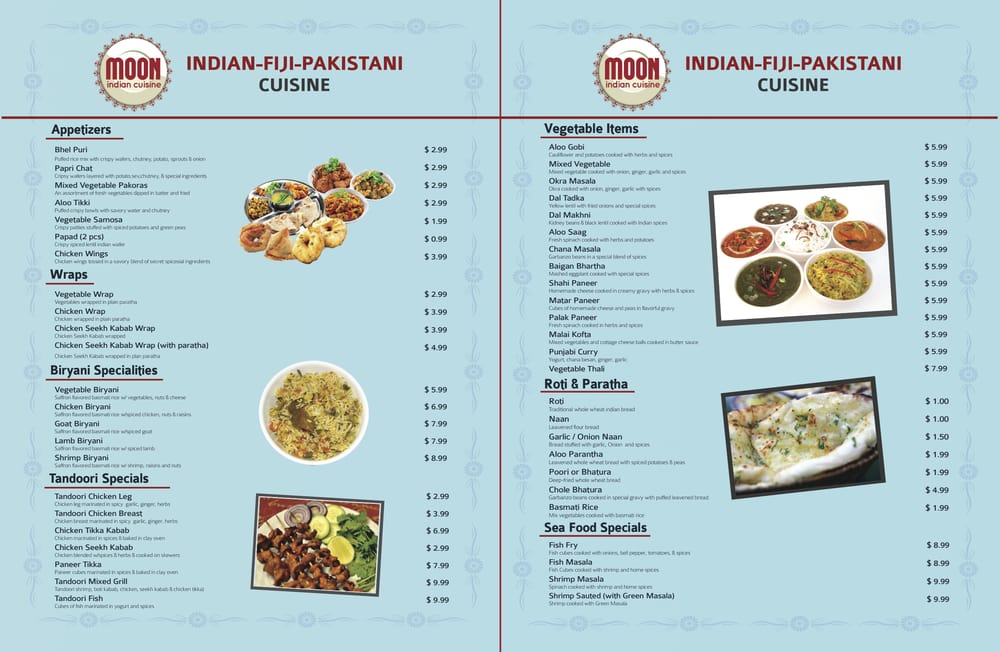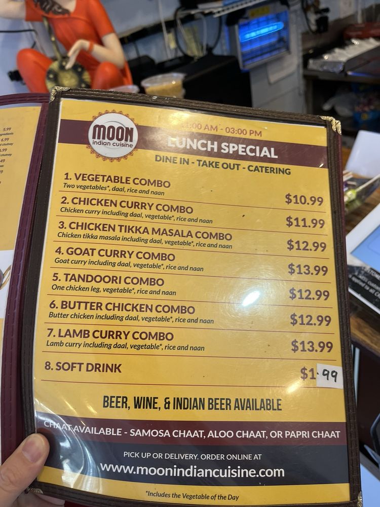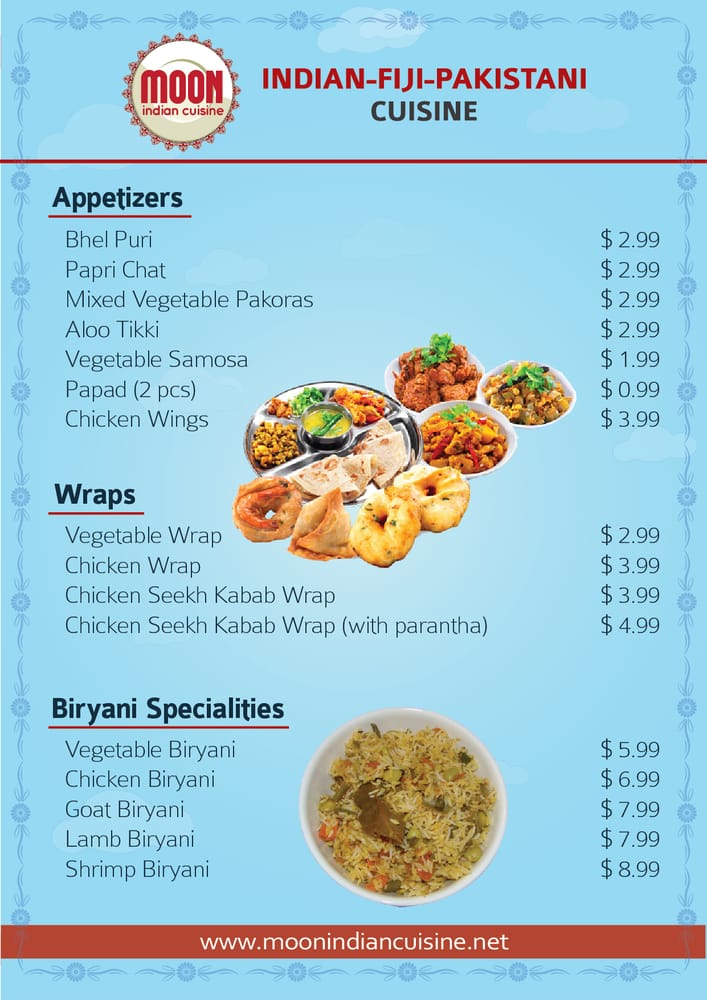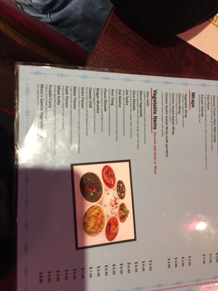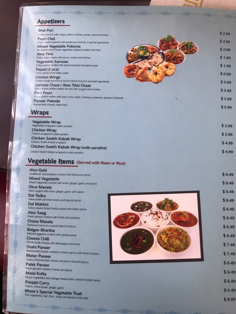 Moon Indian Cuisine is a seafood restaurant located in Hayward, CA. They offer a wide range of appetizers like Aloo Tikki, Veg Samosa, and Chicken Wings. Their vegetarian entrees include Aloo Gobi, Paneer dishes, and Mixed Veg. The wraps section offers Chicken Seekh Kabab and Vegetable wraps. Customers praise the delicious food, generous portions, and great service at Moon Indian Cuisine. Reviews mention favorites like Chicken Tikka Masala, Butter Chicken, and Aloo Gobi. The staff is attentive and accommodating, making the dining experience enjoyable. Overall, Moon Indian Cuisine is highly recommended for authentic Punjabi cuisine with a variety of options for seafood lovers. The restaurant's cozy ambiance and friendly service create a welcoming atmosphere for all diners.